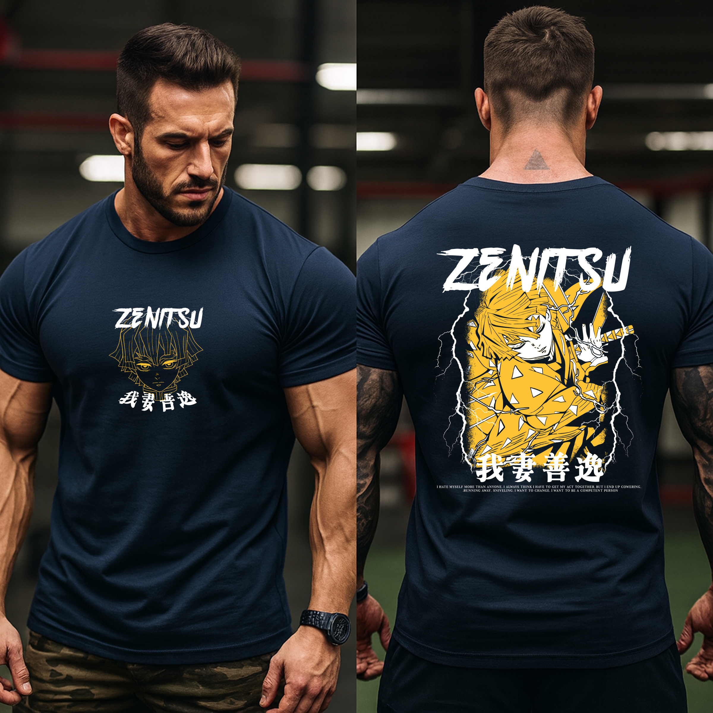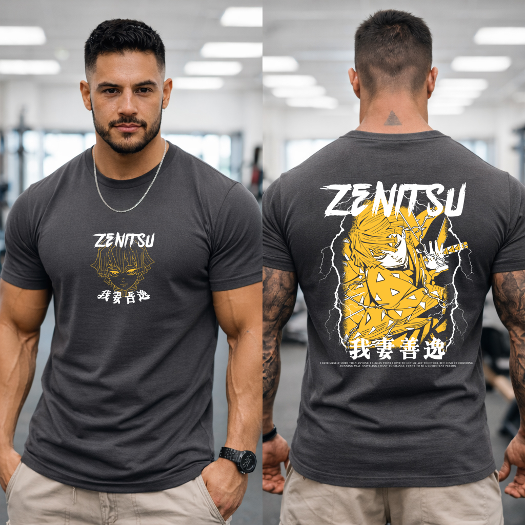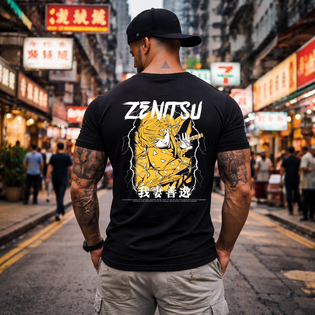 This premium anime-inspired graphic t-shirt features a minimal front chest print and a high-impact full back design with powerful lightning energy and Japanese-inspired typography.