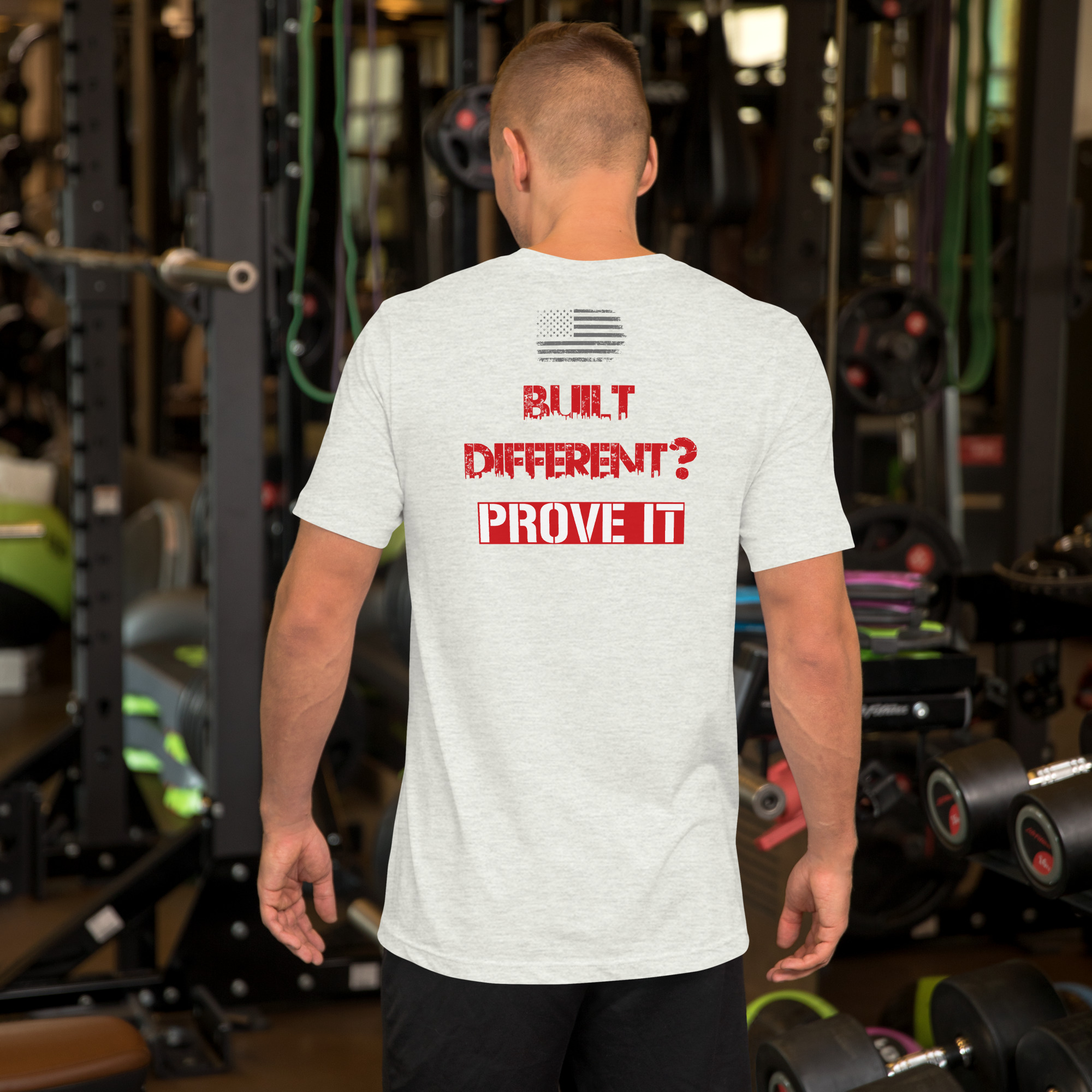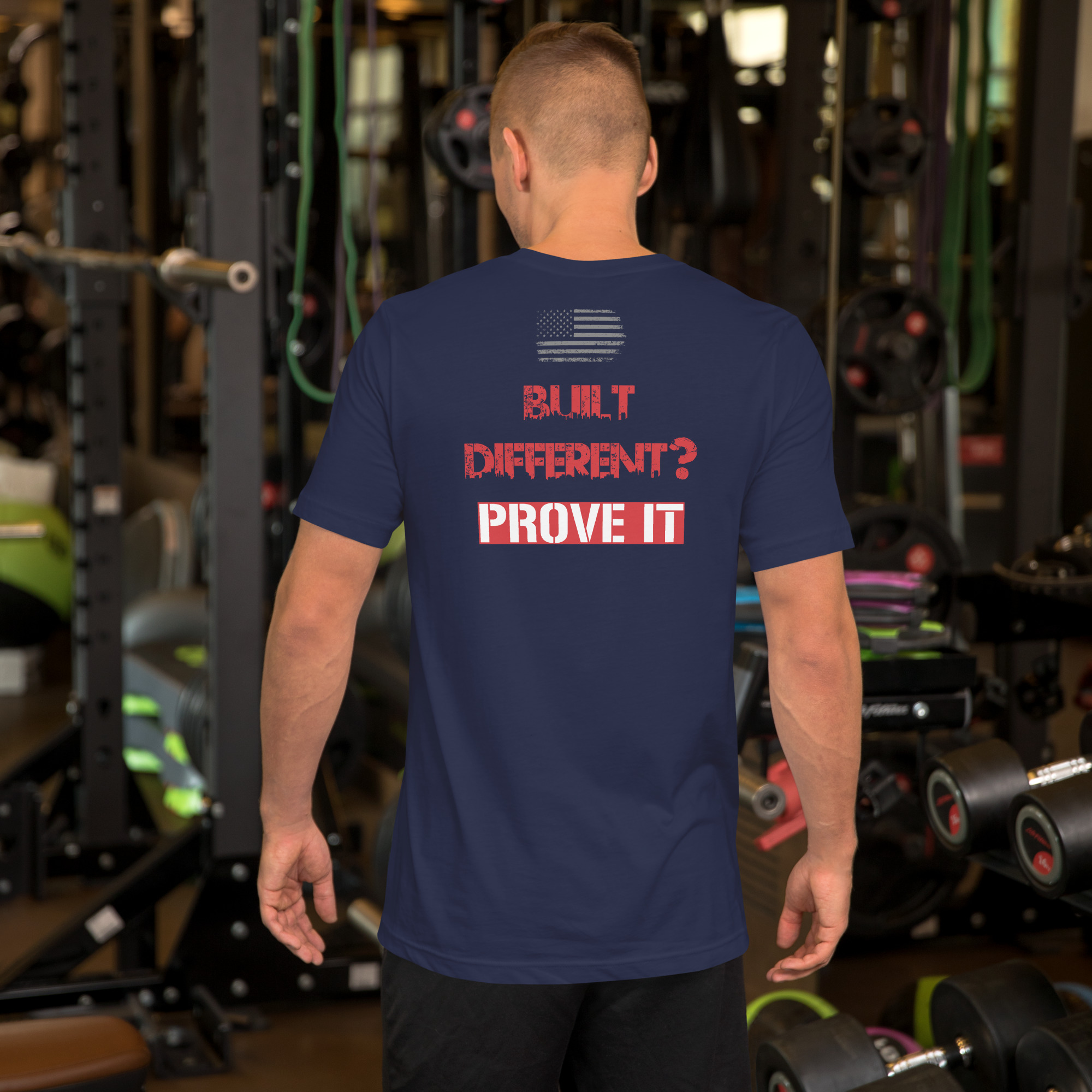 Show the world what you’re made of with the Built Different? Prove It. Gym T-Shirt. Designed for those who train harder, push boundaries, and live with unmatched drive, this shirt represent your commitment to excellence and strength. Whether you’re crushing workouts, striving for fitness goals, or simply making a statement, this shirt is crafted for athletes like you who live life with purpose.