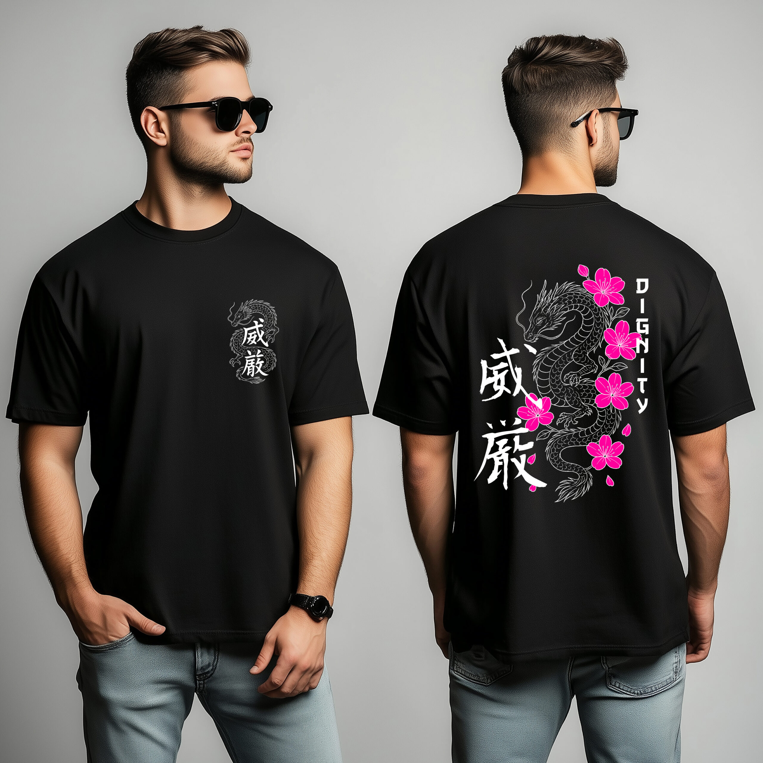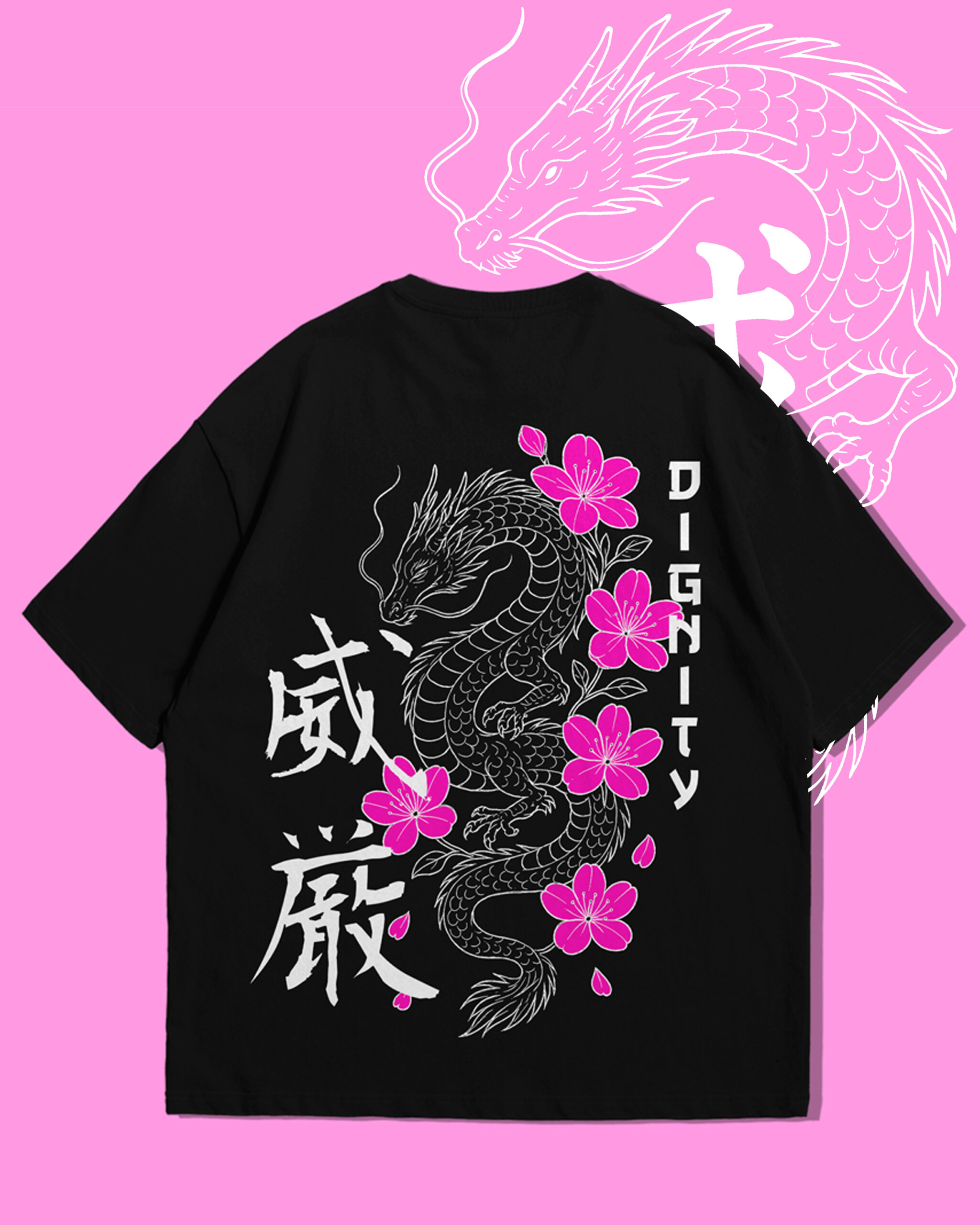 Back: Showcases a large, intricate white outline of a majestic dragon, symbolizing power, wisdom, and prosperity, gracefully intertwined with vibrant pink cherry blossoms, representing beauty, life, and renewal. The word “DIGNITY” is also prominently displayed vertically on the side, reinforcing the shirt’s core message.