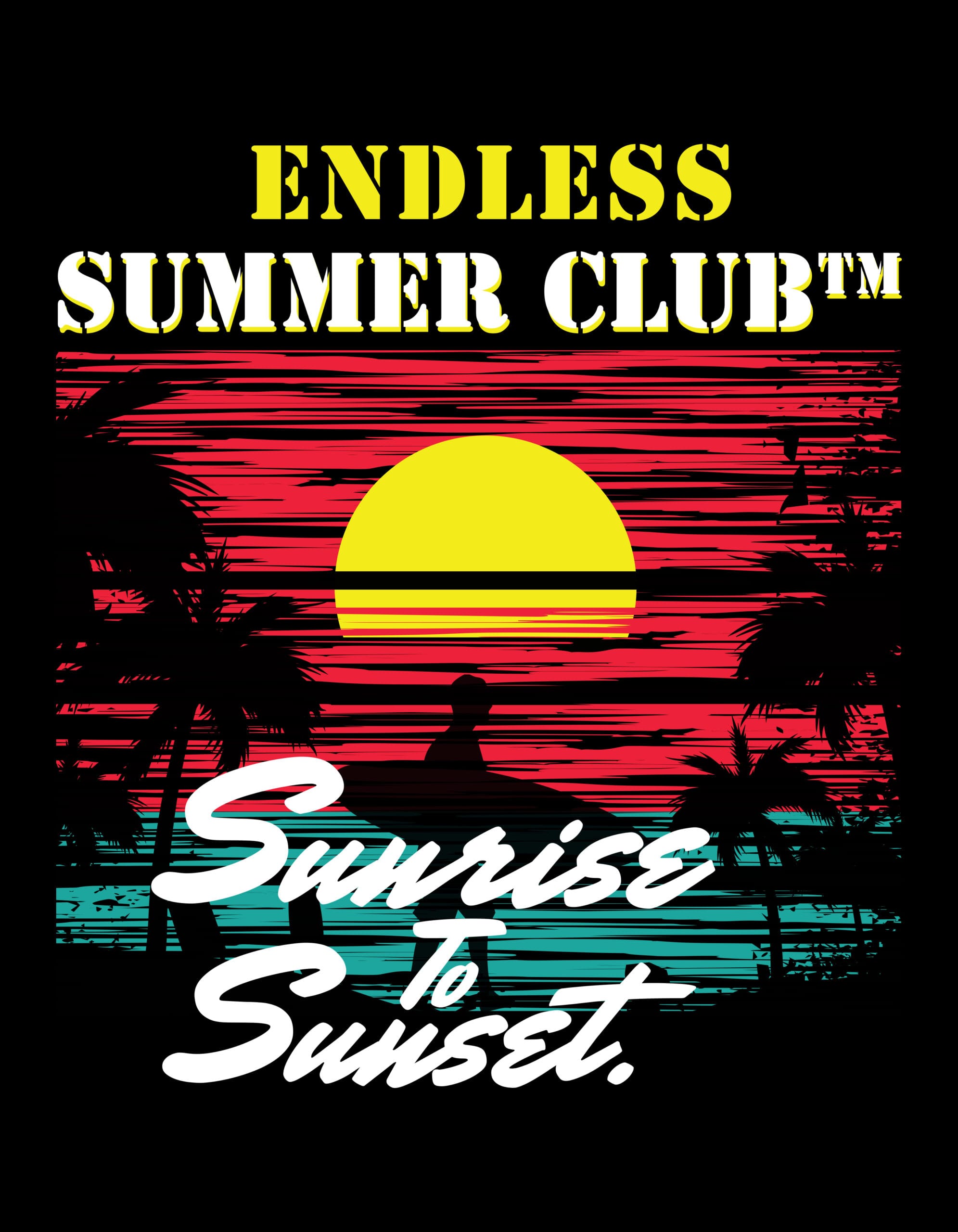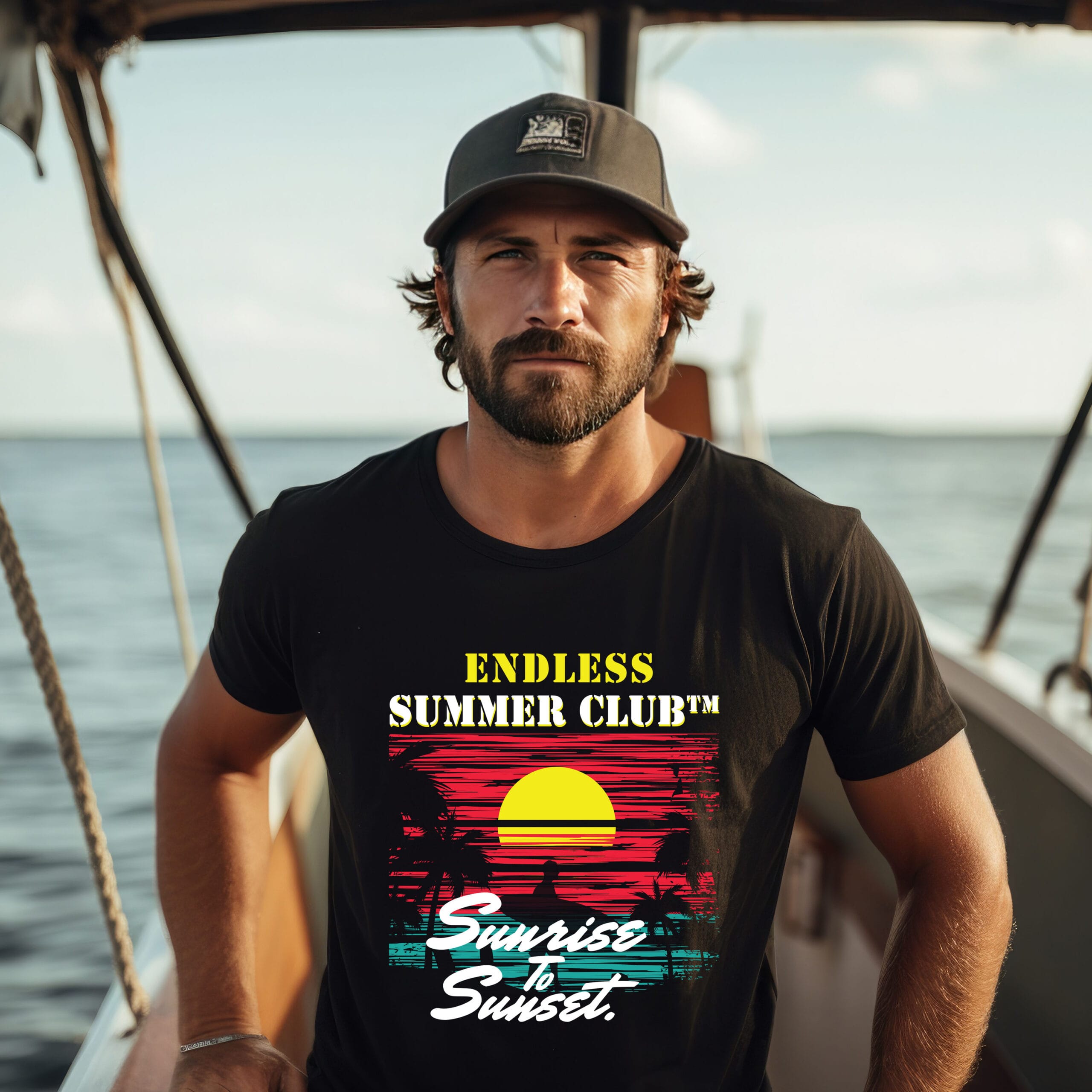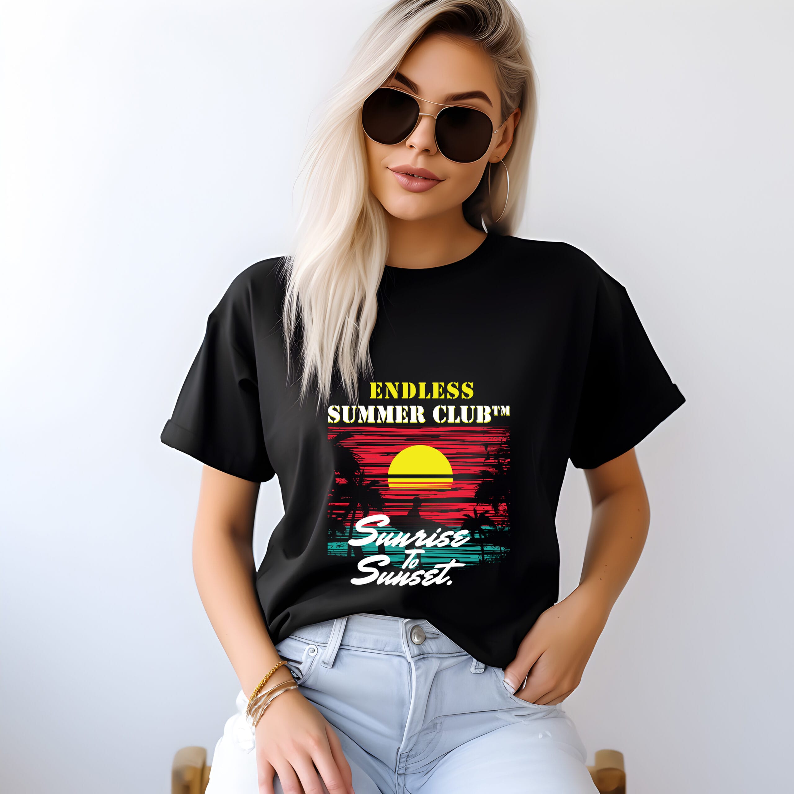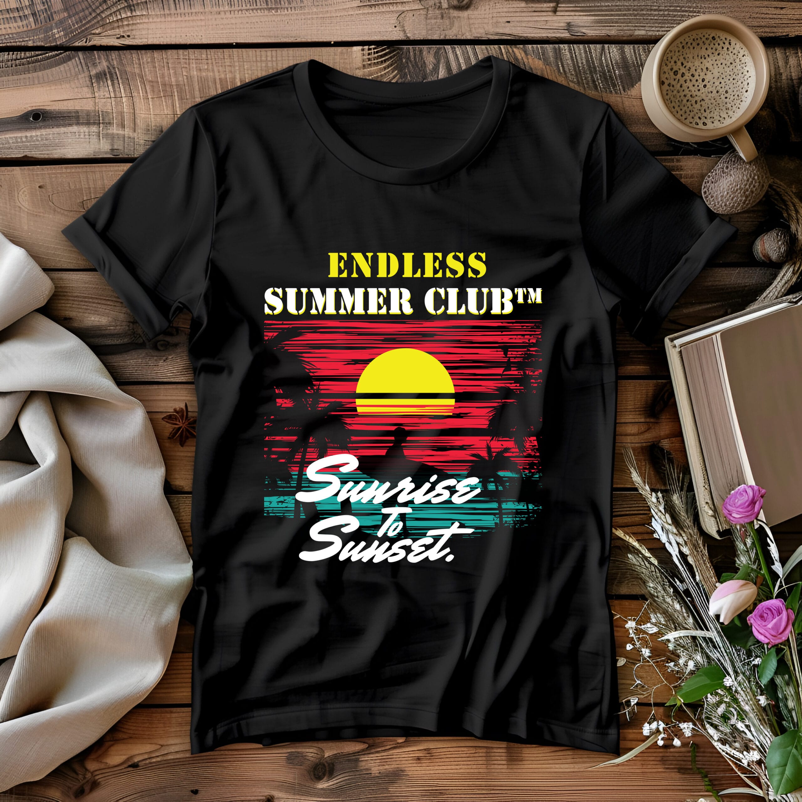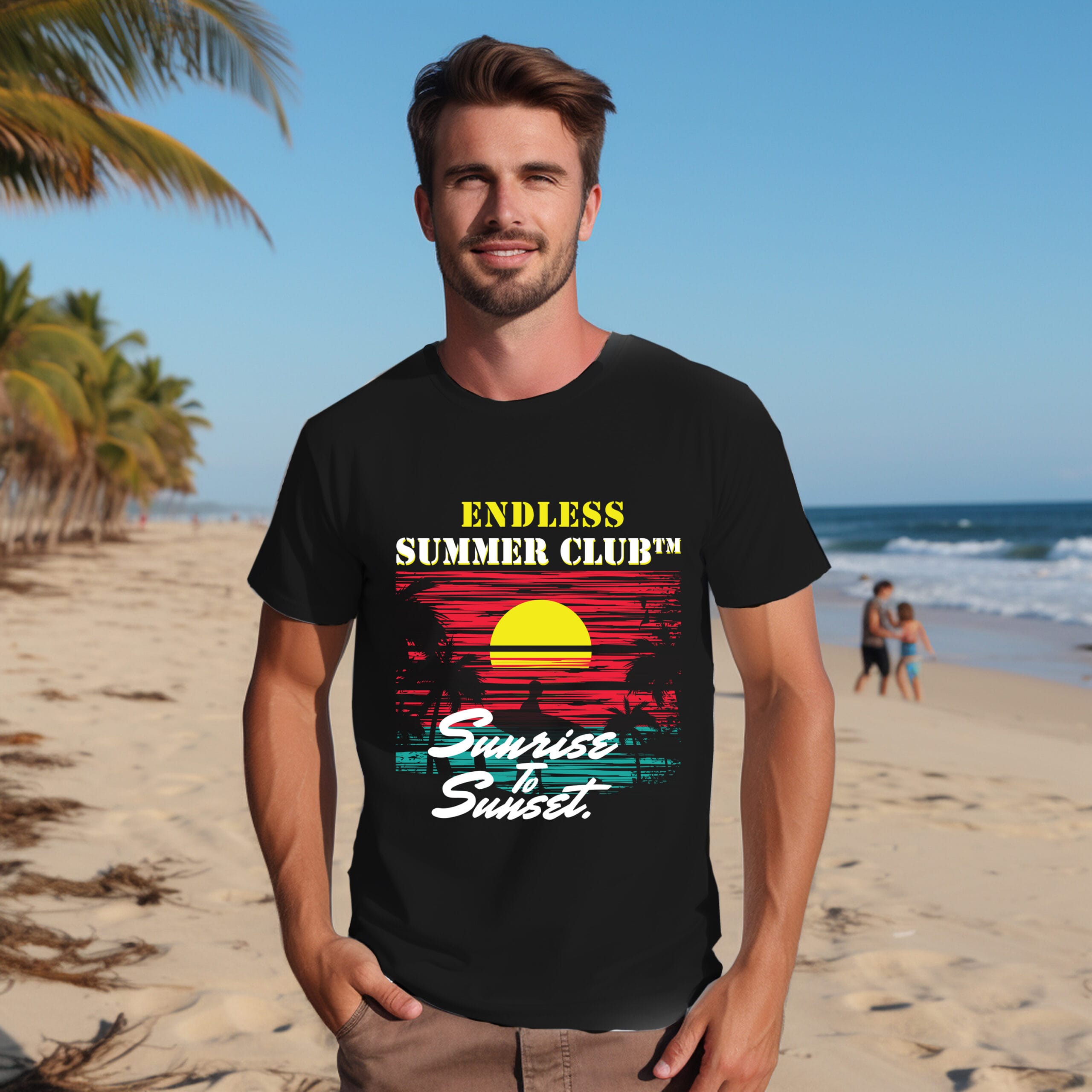 TeeFlow USA Endless Summer Club Retro Sunset Tee – 80s Vaporwave Beach Graphic T-Shirt, Unisex Cotton Blend