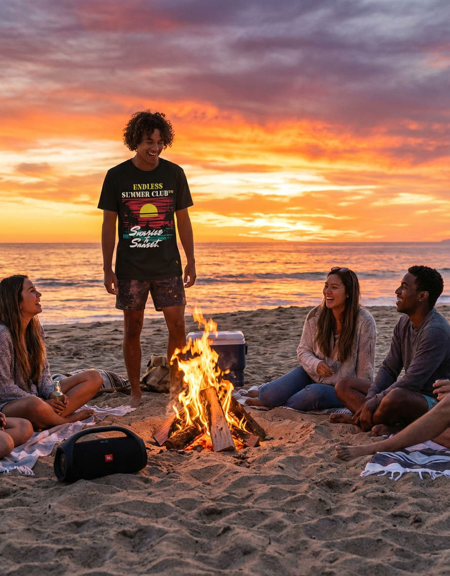 A man wears the TeeFlow USA Endless Summer Club Retro Sunset Tee at a beach bonfire sunset gathering with friends.TeeFlow USA Endless Summer Club Retro Sunset Tee – 80s Vaporwave Beach Graphic T-Shirt, Unisex Cotton Blend
