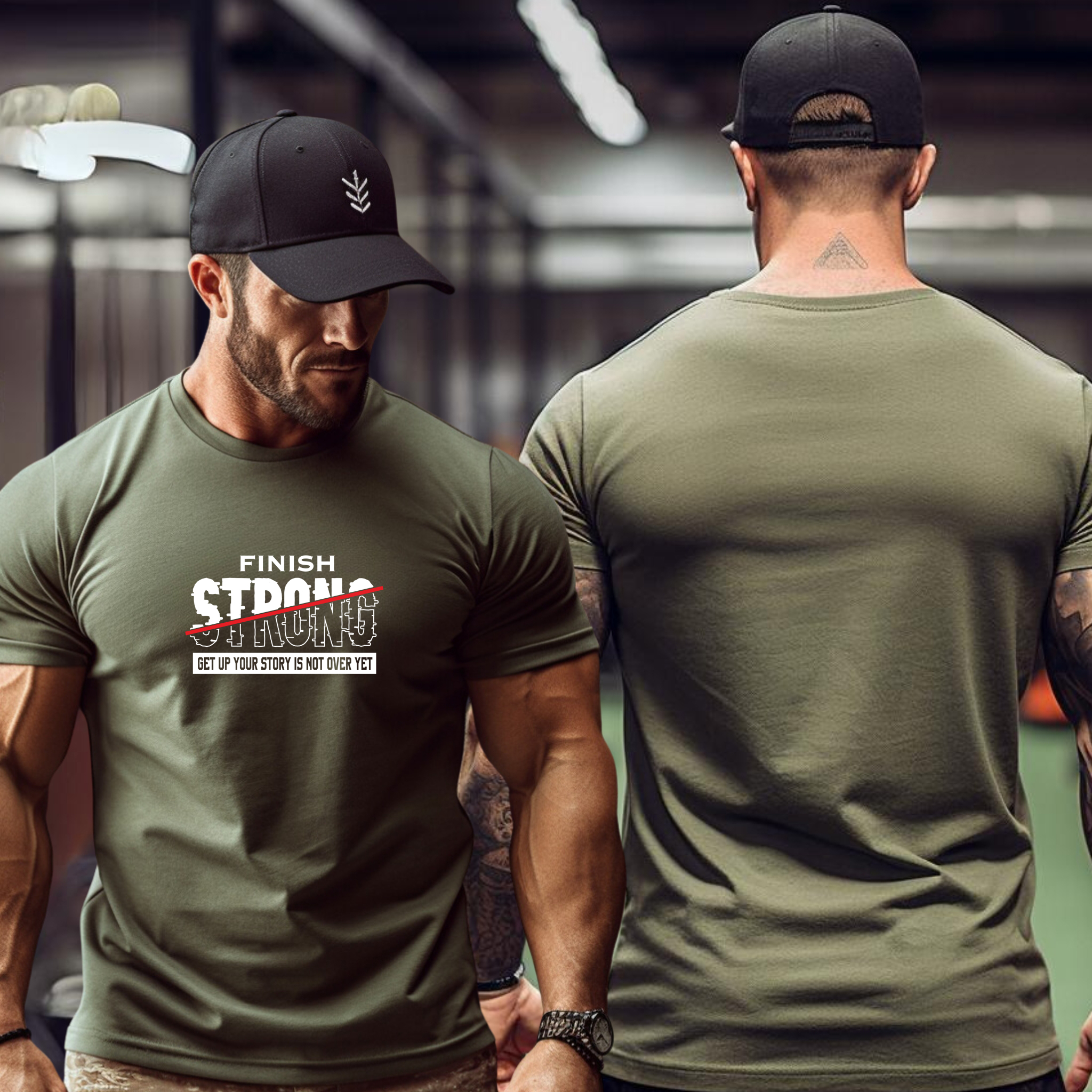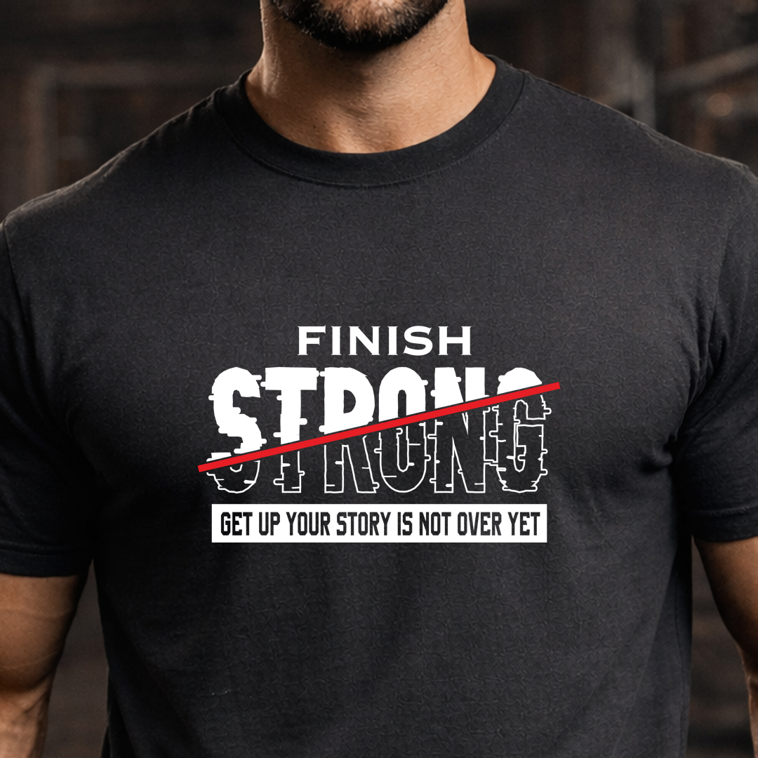 Featuring a bold graphic with FINISH STRONG prominently displayed and GET UP YOUR STORY IS NOT OVER YET as your ultimate mantra, this shirt embodies resilience and determination.