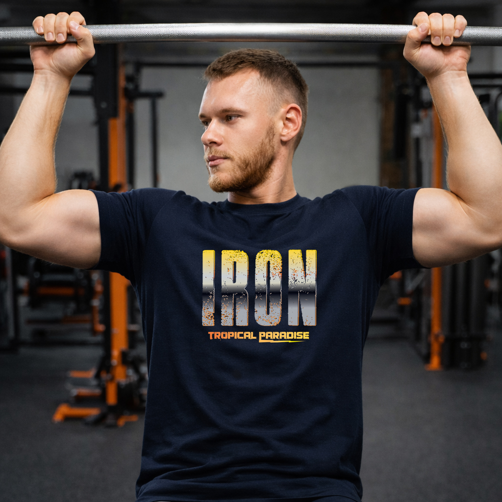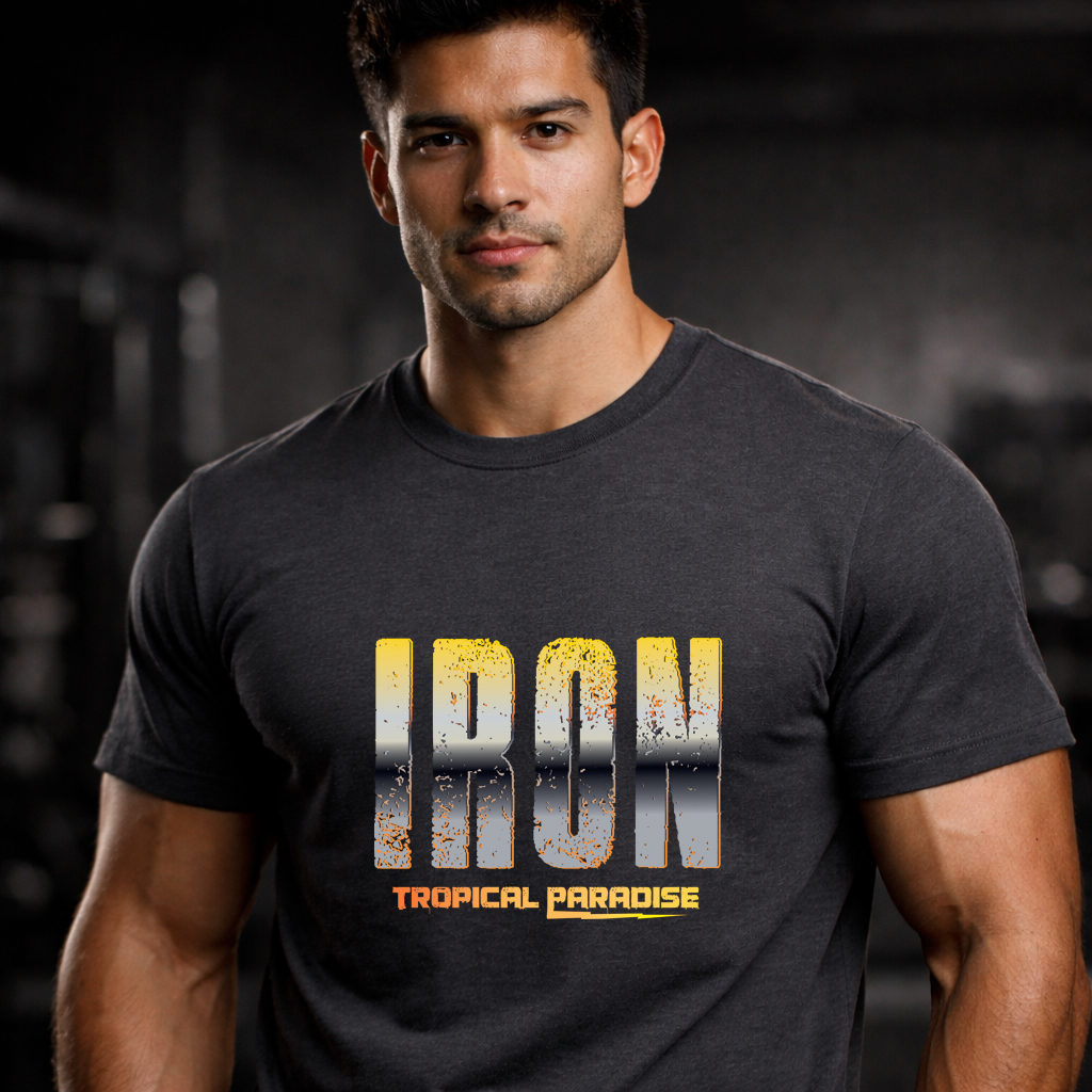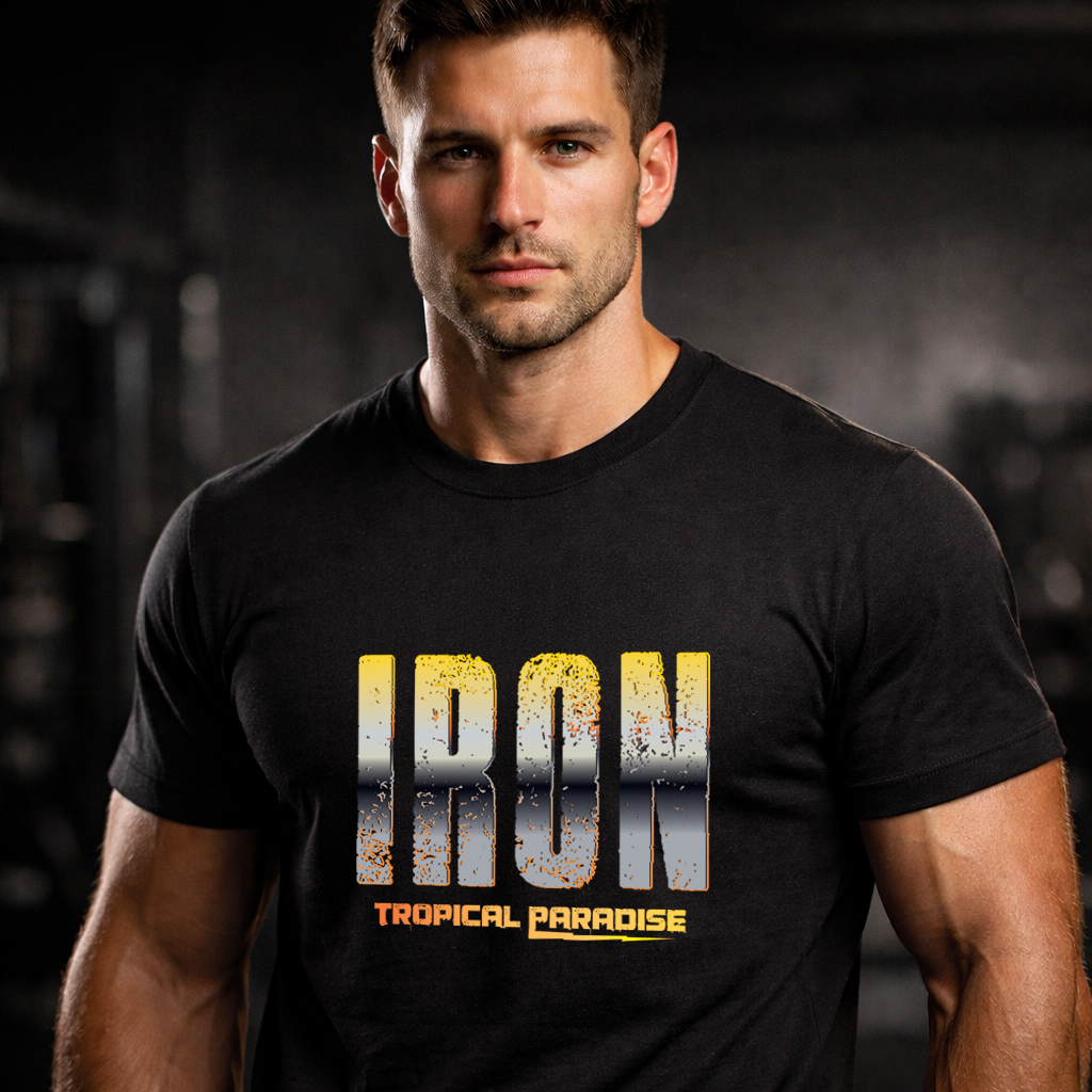 IRON Tropical Paradise Gym T Shirt built for men who train with intensity and demand strength in every session. This design combines bold tropical energy with heavyweight gym performance, creating a powerful statement piece for serious athletes.