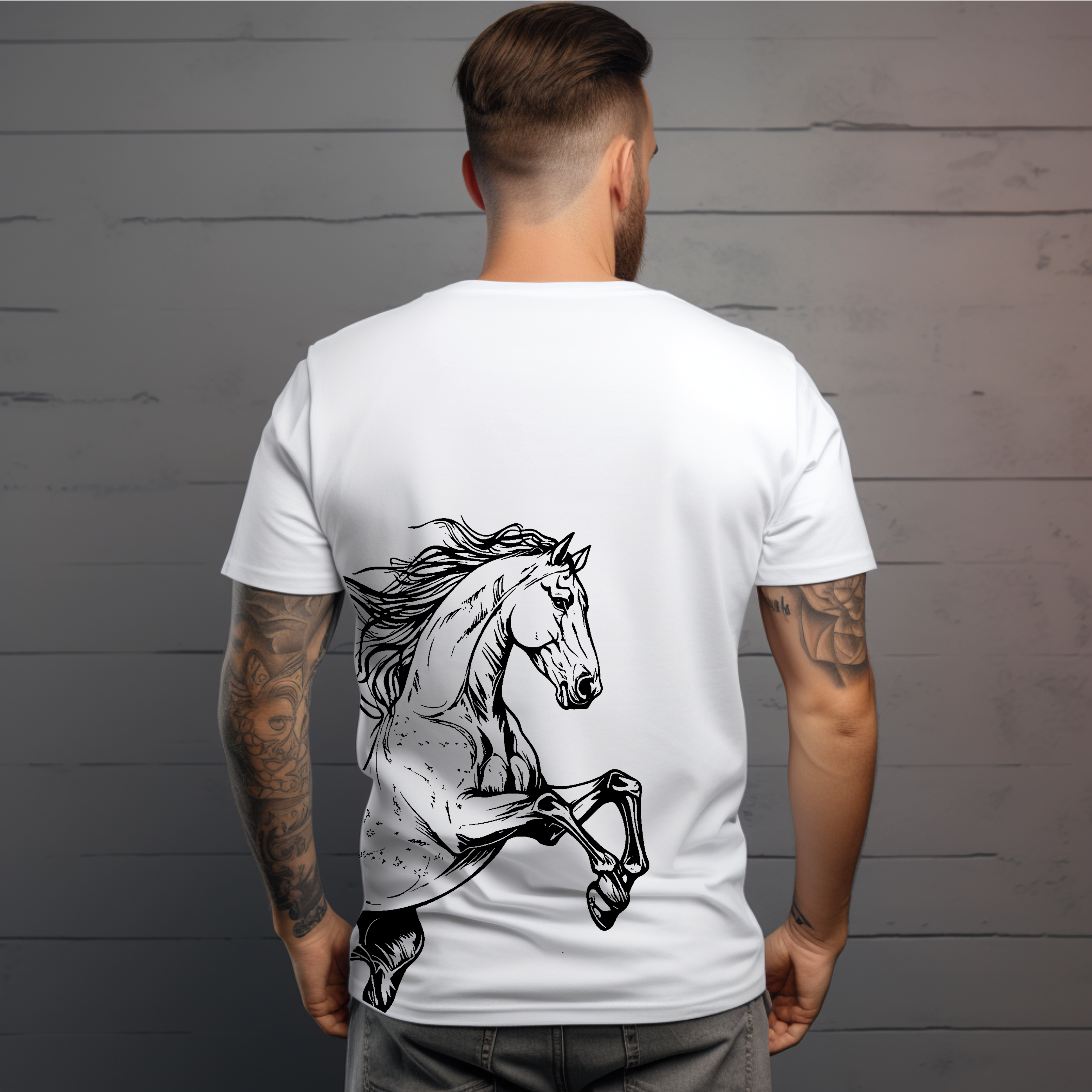 The front features a subtle and stylish left-chest design with the words “Free Spirit” accompanied by a minimalist line-art horse. But the real showstopper is on the back: a large, captivating graphic of a powerful rearing horse, rendered in a striking sketch style that embodies strength and freedom.