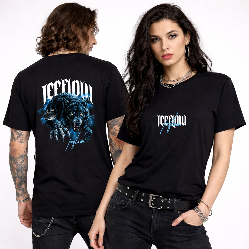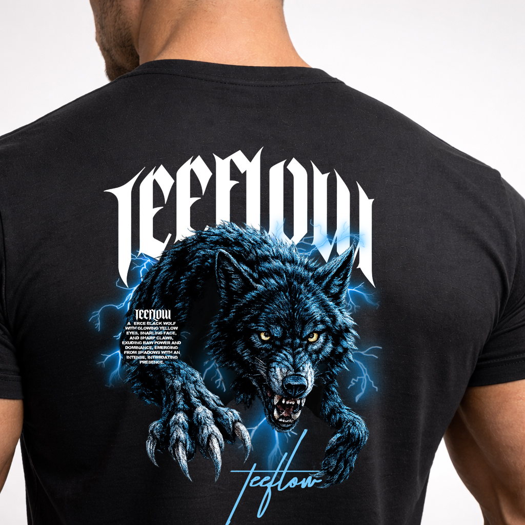 The electric blue lightning surrounding the wolf symbolizes energy under control. The wolf itself represents leadership, loyalty to your circle, and calculated dominance. The gothic front detail keeps the aesthetic grounded in modern street culture while the oversized back graphic delivers strong visual impact.