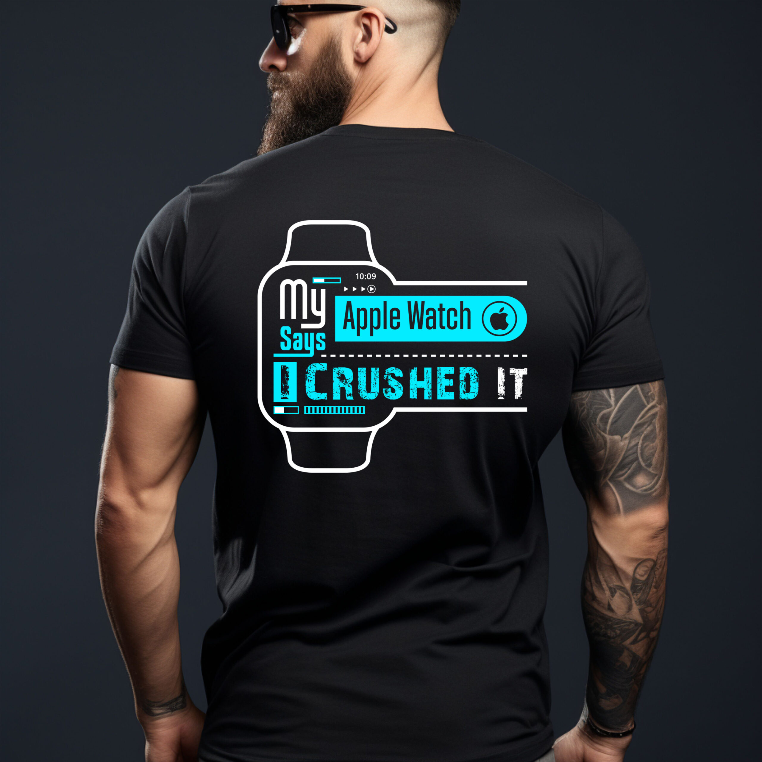 This unique tee features the celebratory phrase built directly into a stylish, schematic blueprint of the iconic Apple Watch itself. The cool cyan and white line art on a classic navy blue shirt creates a sharp, modern aesthetic that’s perfect for the discerning tech enthusiast. It’s a subtle, intelligent nod to the gadget that tracks your every victory.