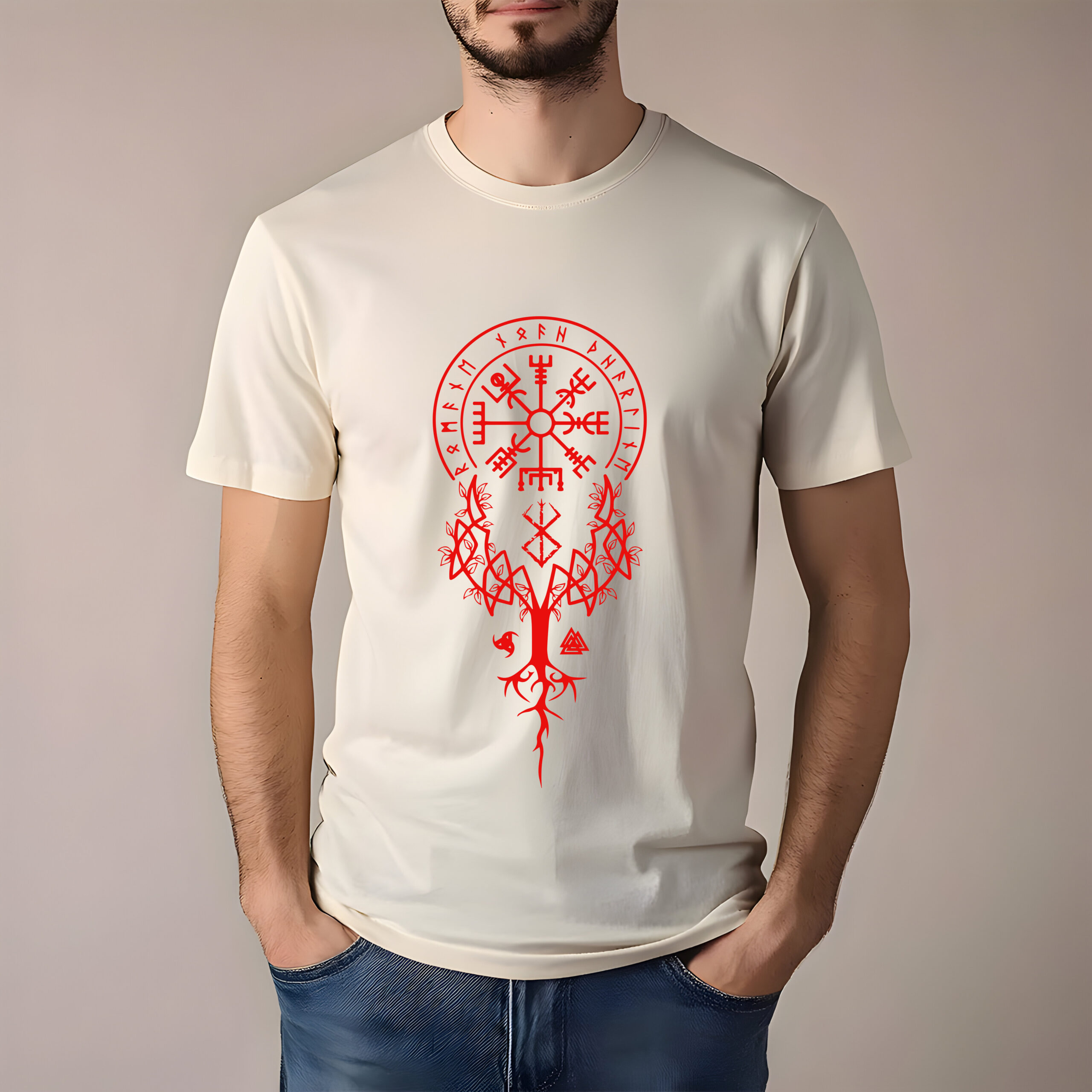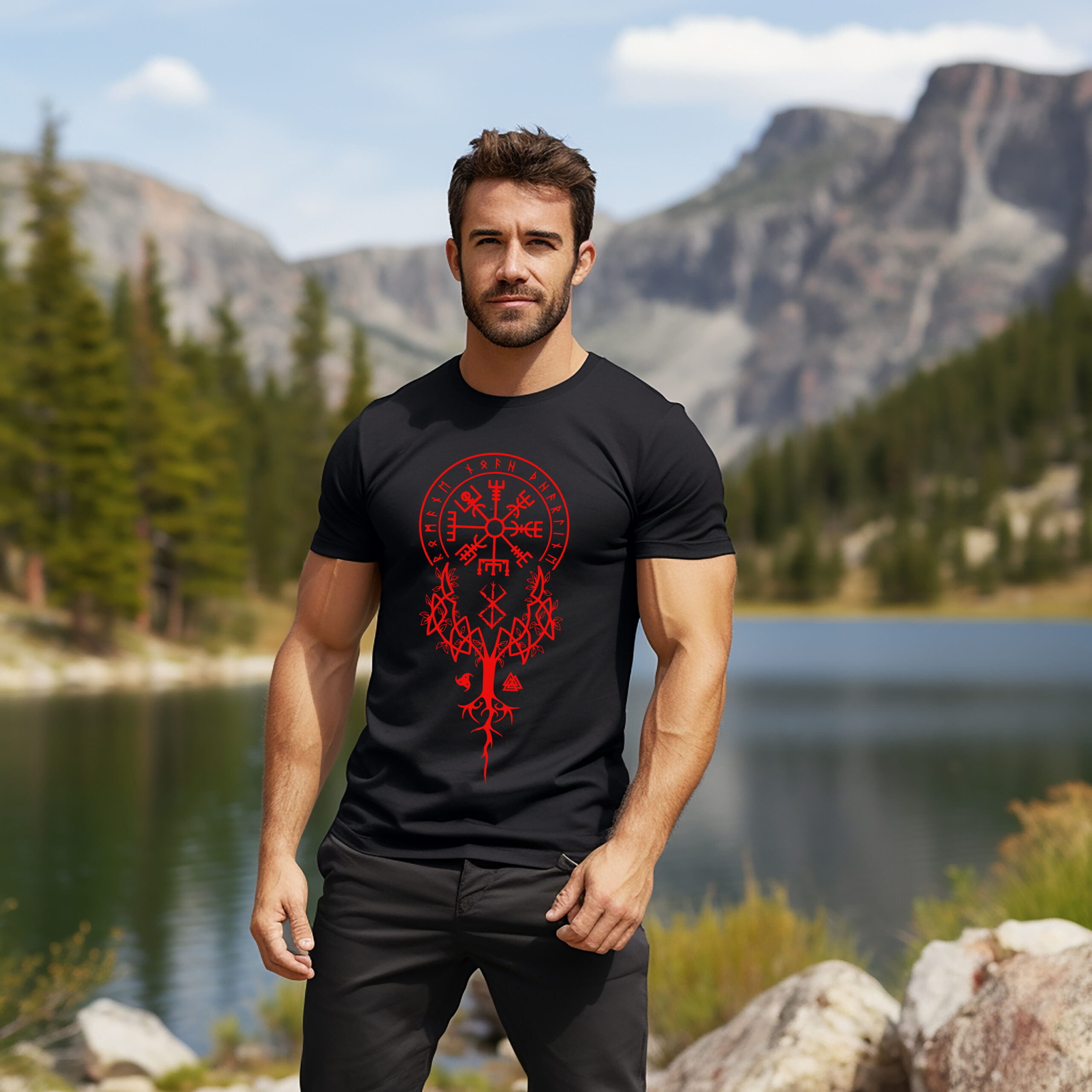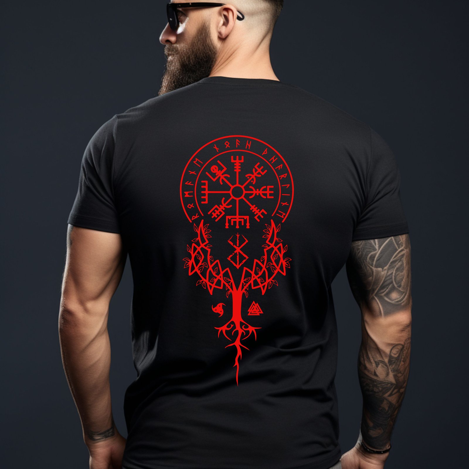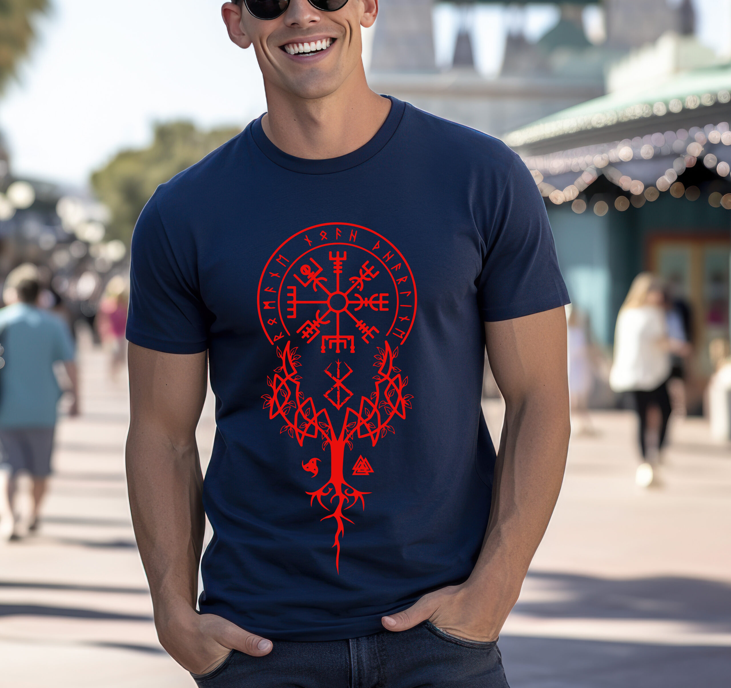 Embrace the power of ancient Norse symbols with our Vegvisir and Yggdrasil t-shirt. The Vegvisir, or Viking Compass, is a symbol of guidance and protection, believed to help the wearer find their way through storms. Yggdrasil, the World Tree, connects the nine realms of the Norse cosmos. This powerful combination of symbols represents guidance, protection, and connection. Crafted with a stunning red design on a comfortable, high-quality t-shirt, it’s perfect for anyone who appreciates Viking lore and unique, meaningful designs. Wear your heritage and navigate your world with confidence.