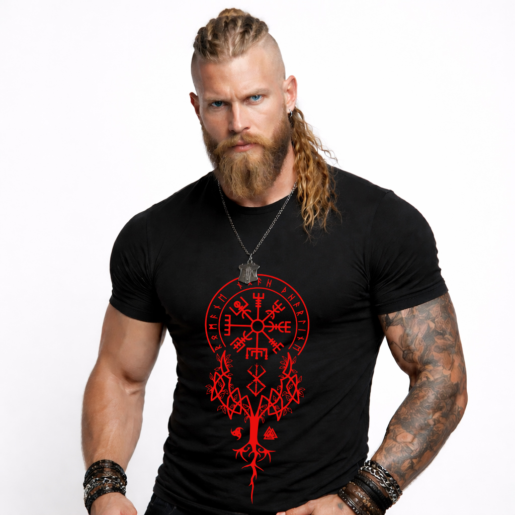 Designed for people who love Norse symbolism, minimalist streetwear, and powerful artwork, this tee features a premium Nordic-inspired composition that combines the Vegvisir compass, rune-style details, and a Tree of Life inspired layout.