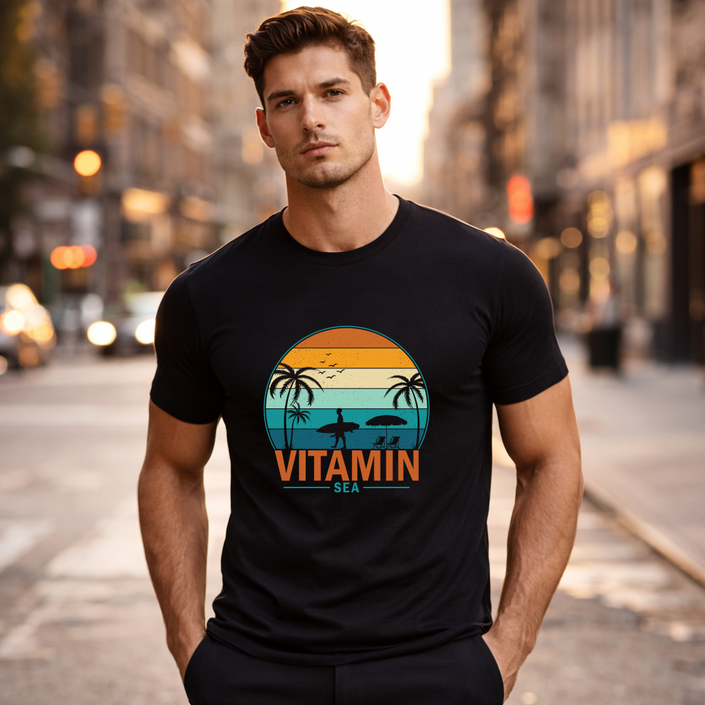 This design features a clean retro sunset circle with palm trees, surf vibes, and bold typography that reads VITAMIN SEA — a fun play on words that instantly gives summer energy.